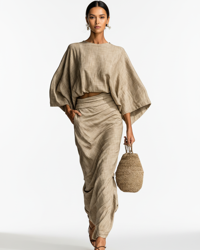 El conjunto Paula es elegancia relajada en estado puro. Este diseño de dos piezas presenta un top holgado de manga larga estilo murciélago y una falda larga de corte fluido, logrando el equilibrio perfecto entre comodidad y sofisticación.